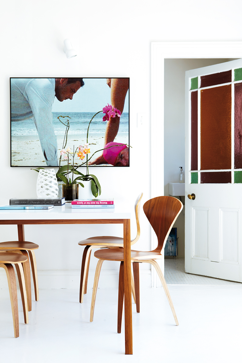 Och hemmet är otroligt välproportionerat med tanke på sina ringa 125 kvadratmeter. Det är fördelat över två våningar. På övervåningen finns ett loftsovrum som leder ut till en liten solterass med utsikt över trädgården, medan gästsovrummet på nedervåningen är undangömt under trappuppgången, tillsammans med badrummet. Loungen på denna våning har en öppen planlösning, och matsalen och köket sträcker sig runt trädgården i en härlig L-form. De köpte sitt vackra hus för ett år sen, efter att deras dåvarande lägenhetskontrakt blev uppsagt med kort varsel.