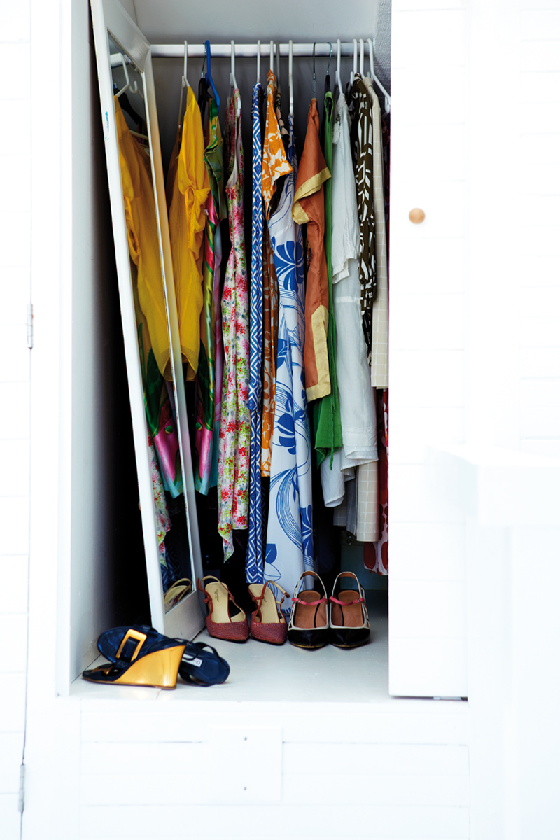 Möjligheter till smart förvaring är en annan av husets kännetecken. I köksskåpen finns det torkställ, i gästrummet finns ett walk-in-skåp med en gömd toalett och i sovrummet har väggarna nästan osynliga skåp och lådor, som får agera Julies garderob.