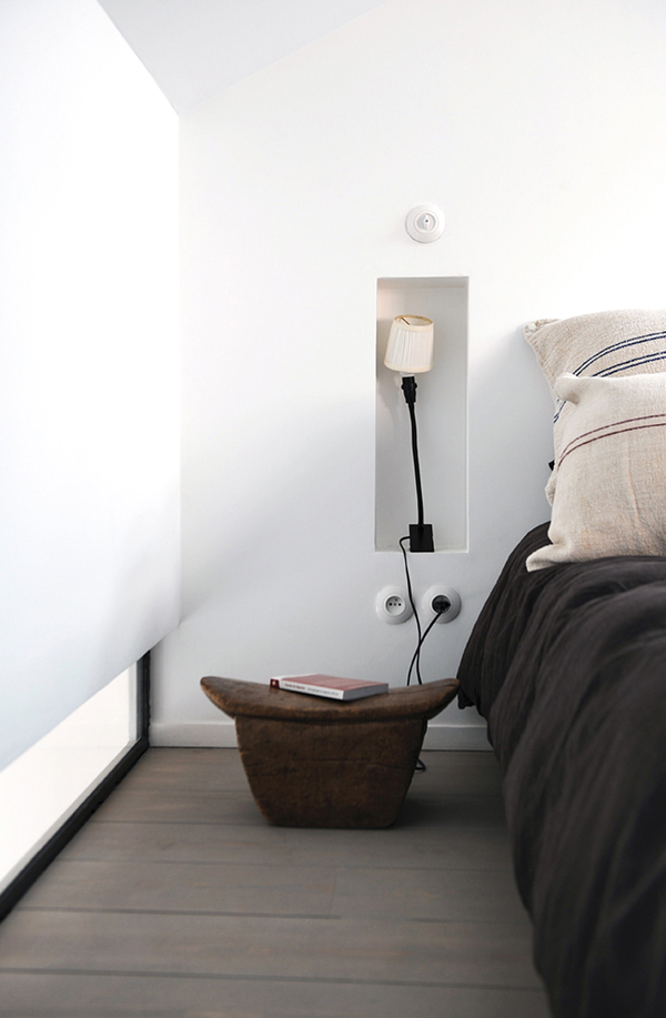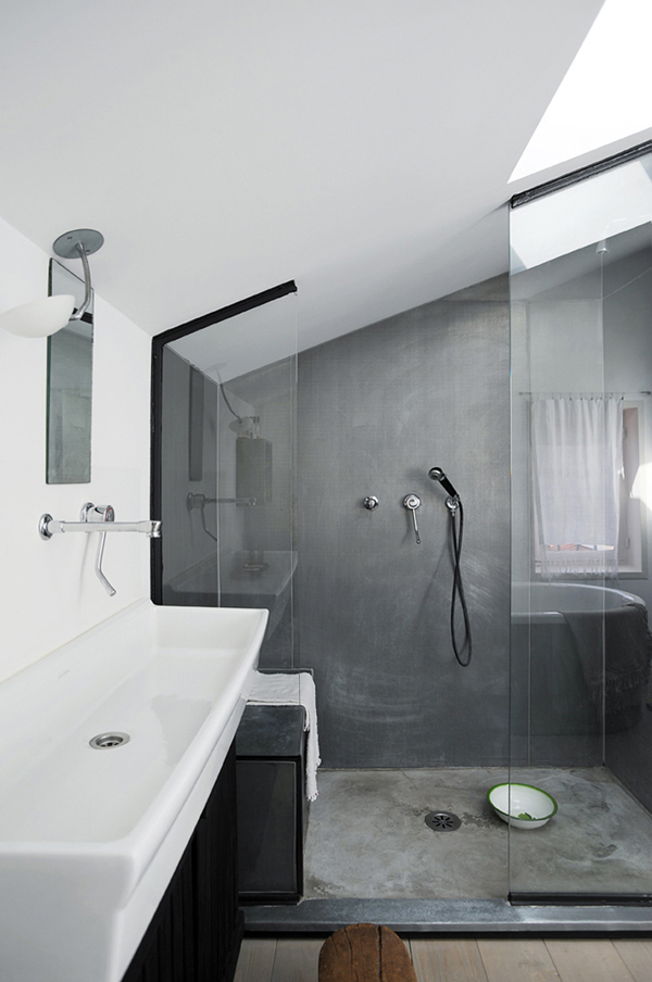 Beträffande badrummet hade Karine och Matthieu endast en enda önskan; inget kakel! Badkaret har ett hölje av trä klätt i patinerad zink från Kaldewei i Tyskland och golvet är lackad parkett. Duschkabinen är helt gjuten i betong med undantag av den lilla sitsen som även den är klädd i patinerad zink.