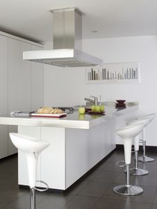 Köket har en allt-i-ett bänkskiva/köksö, som också kan användas för mer avslappnade måltider. Det är färgat i vitt och silver, minimalistiskt och modernt.