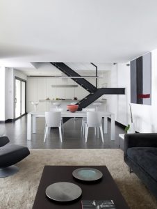 Köket är möblerat med Bombostolar från Magis. En trappuppgång i järn skiljer köket från matsalen. Där finns ett matbord gjort i Carraramarmor och ljusgrå stolar från Molteni. En minimalistisk lampa i form av ett rör lyser upp hela bordet. Modellen heter Seventy seven och kommer från Serien lighting. Alldeles intill ligger vardagsrummet som är möblerat med en stor soffa i svart mocka, tillsammans med en liggfåtölj och en ottoman i svart läder med fot i silver.
