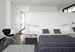 På var sin sida av sängen finns de matchande, vita sängborden Lack, från Ikea. De pryds med silverfärgade läslampor som går under namnet Tolomeo och kommer från Artemide. Sängen är täckt med ett sängöverkast från Armani House. En vit stol med svart stoppning står på ena sidan av sängen. På den andra sidan av hallen finns läsrummet, med inbyggda hyllor för böcker eller andra föremål som man önskar ställa på display.