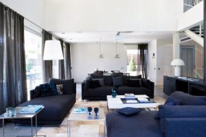 Dess stora fönster som sträcker sig från golv till tak ger en optimal utsikt över allt som händer på utsidan. Rummet är möblerat med soffor och loungesoffor som är placerade på så sätt att de skapar en intim och varm känsla. Möblernas färger och tyger förstärker den varma atmosfären. På golvet finns en lädermatta gjord i lappad stil, som tillåter en att leka med olika färger inom samma palett. Sidoborden ger extrastöd till det stora vardagsrumsbordet.
