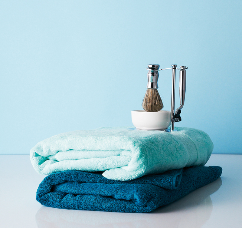 Dekorativa detaljer och väl utvalda redskap ökar komforten och de vardagliga sysslorna i badrummet. Frotté i mörkt turkos, 545 kr, Möve/Gertrude. Ljusturkos, 398 kr. Huntingford/Gertrude. Rakset, Heath, 2 860 kr, Gertrude.