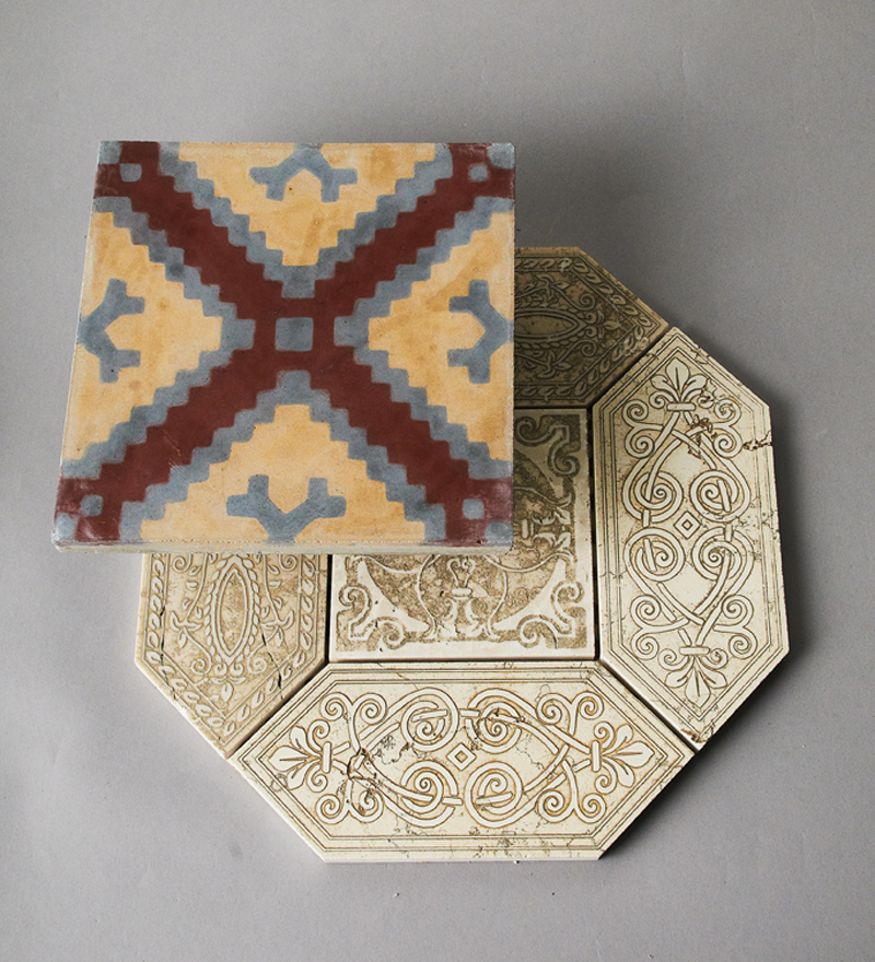Rama in badrummet med etniska mönster och spännande former. Åttkantigt kakel med kvadratisk platta i mitten, Ducale 2 mix, 18 250 kr/kvm, Acrueforti Venice Collection/The Art of Living. Mönstrad betongplatta Kelim, med inspirationen hämtad från Marrakech, design Mats Theselius, 1 295 kr,