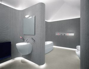 Grå mosaik med dold belysning vid taket förstärker den futuristiska känslan i Alessis badrum. Handfat One, design Stefano Giovannoni för Laufen, Oras och Alessi. Blandare, Il Bagno Alessi, 4 992 kr, Oras. Badkar One, 66 297 kr, Laufen, allt under namnet Alessi One/Duo Bad.