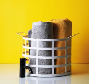 Förvaringskorgar och lådor finner sin plats på hyllor och i hörn i badrummet. Vit korg, Cage Metal, design Jonas Wagell, 2 900 kr, David Design/Snickarbacken 7. Svart handfatsblandare, 5 400 kr, Vola/Centro. Grå frottébadlakan, 398 kr, Huntingford/Gertrude. Gult badlakan, 545 kr, Möve/Gertrude.