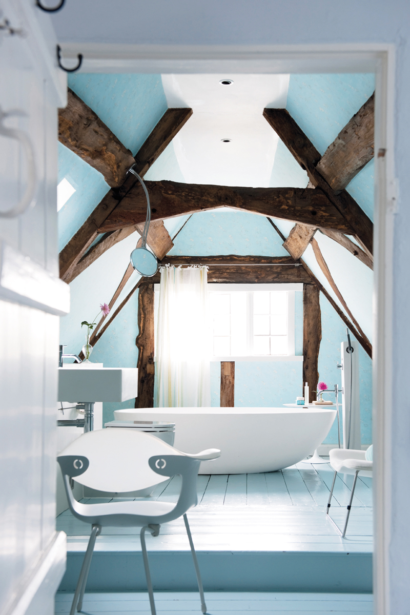 Ett romantiskt badrum med en mix av moderna former och antika inslag. De gamla takbjälkarna är bevarade i det i övrigt nyrenoverade rummet. Ett fristående badkar vid fönstret skapar rumskänsla. Inredning Trica Guild. Liknande badkar med fristående blandarpelare och handfat i Corian, finns hos det italienska företaget Agape. Foto James Merell, ur boken Stilsäkert av Tricia Guild/Bokförlaget Max Ström 2010.
